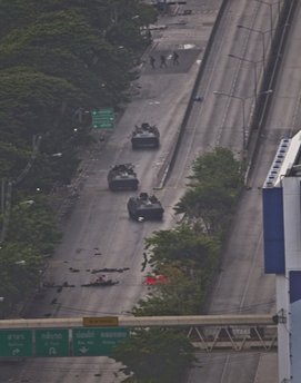 軍方擴大了對紅衫軍聚集區(qū)的封鎖范圍,并使用擴音器呼吁在這一區(qū)域內(nèi)的所有人返家。昨晚有傳聞軍方將展開清場行動,今晨仍能聽到零星槍聲。