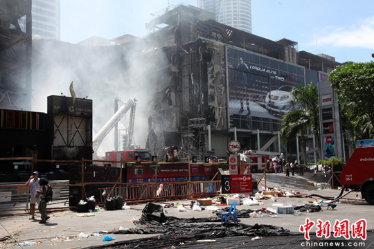 離此咫尺之遙的便是曾被曼谷人引以為豪、號稱亞洲第二大的森特沃購物中心,19日下午被人放火燃燒。記者在現(xiàn)場看到,該樓的部分建筑已經(jīng)垮塌,三支高壓水龍正對著垮塌處噴水。據(jù)稱,當天搜救人員從廢墟中發(fā)現(xiàn)一年齡大約35歲男子的尸體。官方初步估計,曼谷19日晚至20日晨火災造成的損失或達數(shù)十億美元。