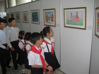 致辭結(jié)束后,出席開幕式的領(lǐng)導(dǎo)和學(xué)生們參觀了書畫展。萬景臺(tái)少年宮寬敞明亮的大廳頓時(shí)人頭攢動(dòng)、熱鬧非常,一塊塊高大的展板前,身穿校服、圍系紅領(lǐng)巾的朝鮮少年兒童們興高采烈地觀看著一幅幅書畫作品。上海市對外文化交流協(xié)會(huì)代表團(tuán)團(tuán)長高嶺女士參觀書畫展后表示,朝鮮少年兒童的書法和繪畫水平高超,顯示出了扎實(shí)的藝術(shù)功底,且主題性強(qiáng),表達(dá)了他們對中朝友誼的祝福。朝鮮對外文化聯(lián)絡(luò)委員會(huì)副委員長田英進(jìn)也表示,中國少年兒童的想像力、創(chuàng)造力豐富,通過畫作表現(xiàn)出了積極向上的精神面貌和對未來的向往。