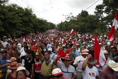 中新網(wǎng)7月6日電 據(jù)法新社等媒體報(bào)道,洪都拉斯被逐總統(tǒng)塞拉亞的專機(jī)當(dāng)?shù)貢r(shí)間5日無法在洪都拉斯首都的機(jī)場降落,只得在尼加拉瓜首都機(jī)場降落。而3萬民眾在洪都拉斯的機(jī)場附近示威游行。示威者和警方發(fā)生了沖突,目前造成2人死亡,2人受傷。