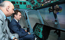 Tranzas公司方面向梅德韋杰夫展示了為專業(yè)飛行員制造的高級訓(xùn)練臺。它能夠模擬在俄羅斯最受歡迎的米格-8型直升機的飛行。公司學(xué)習(xí)部門的主任葉甫蓋尼·阿巴庫莫夫和梅德韋杰夫一起坐在米格-8直升機的方向盤前,在圣彼得堡阿德列爾機場最不利的條件下進行了一次駕駛。