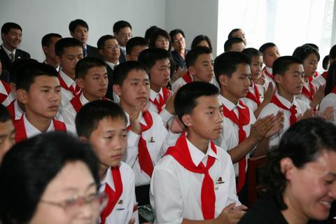 參觀結(jié)束后,劉大使一行與“毛澤東班”全體師生在學(xué)校禮堂舉行了紀(jì)念聯(lián)歡活動(dòng)。東平壤一中校長康相福在講話中首先歡迎劉大使及北京五中代表團(tuán)在“毛澤東班”命名50周年之際來到學(xué)校。他說,金日成主席和毛澤東主席為我們締造了朝中友好關(guān)系,兩國人民對(duì)他們懷有無限的敬仰之情。50年前的今天,在朝中兩國人民之間的戰(zhàn)斗友誼不斷加深之際,“毛澤東班”得以命名。自那時(shí)起,東平壤一中“毛澤東班”和北京五中“金日成班”開展了活躍的友好交流,為加深兩國青少年及兩國人民間的友好感情作出了貢獻(xiàn)。每逢重要節(jié)日,“毛澤東班”和“金日成班”的師生們總會(huì)互致問候。去年,東平壤一中代表團(tuán)訪華,參加了北京五中建校80周年慶;顒(dòng)。明年將是“金日成班”命名60周年。相信兩校兩班將為朝中友誼的不斷發(fā)展做出積極貢獻(xiàn)。