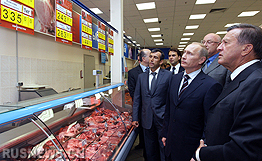 陪同普京前往“十字路口”超市連鎖店的有俄羅斯政府第一副總理祖布科夫和商界代表等。普京首先走到奶制品柜臺前,詢問了奶制品加價情況?瓢屠瓭色@悉,超市中的奶制品平均加價10盧布出售,但他指出,“也有低于成本價出售的情況”。