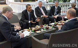 普京在官邸入口處迎接了奧巴馬。普京、奧巴馬以及他們的親近助理在早餐時(shí)候交流。
