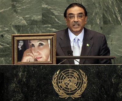 中新網(wǎng)9月27日電 巴基斯坦總統(tǒng)扎爾達(dá)里在聯(lián)合國大會上演講時,把他的已故夫人貝-布托和岳父布托的照片擺上演講臺,并吁請世界各國為巴國打擊恐怖主義和宗教極端主義提供更多協(xié)助。
