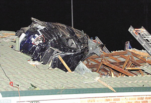 19日凌晨,尚在睡夢(mèng)中的阿諾德夫婦突然被一聲巨響驚醒,他們感到自己家的平房似乎在震動(dòng),于是立即抱著僅有3個(gè)月大的女兒沖出了室外。他們被眼前的一幕驚呆了:一輛汽車砸爛了他們家的屋頂,而且一半車身已經(jīng)陷了進(jìn)去。如果汽車掉進(jìn)他們家臥室的話,后果將不堪設(shè)想。