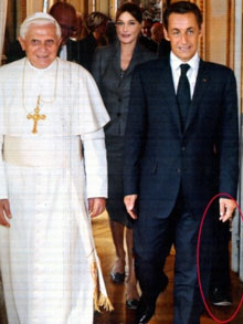法國《巴黎競賽畫報》日前刊登了一張法國總統(tǒng)薩科齊和第一夫人卡拉·布呂妮9月12日在巴黎愛麗舍宮接見羅馬教皇本篤十六世的照片,但這張照片卻讓雜志讀者們大感驚詫,因為人們發(fā)現(xiàn),法國總統(tǒng)薩科齊的左腿邊竟然憑空多出一條腿,可他左邊看起來并沒有站著其他人,就好像薩科齊本人長出了“3條腿”一樣!