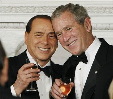 意大利總理貝盧斯科尼14日參加完在巴黎舉行的歐盟國家領(lǐng)導(dǎo)人會(huì)議之后,前往華盛頓會(huì)見布什。兩人舉止親密,臂挽著臂在白宮草坪散步,仿佛多年老友。當(dāng)晚,為了紀(jì)念“哥侖布發(fā)現(xiàn)美洲”和歡迎貝盧斯科尼,布什在白宮設(shè)宴招待一些美國和意大利政要。