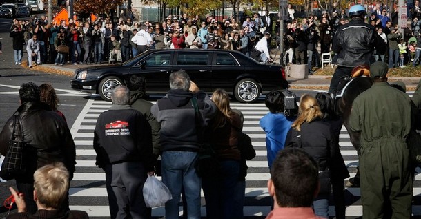 奧巴馬乘坐的豪華轎車駛過街頭,邊上是圍觀歡迎的人群