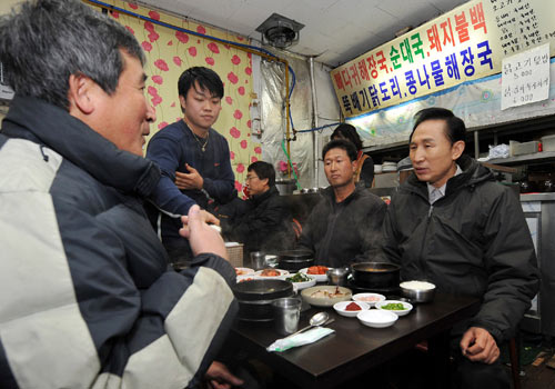 李明博在餐廳與小販一起吃早飯