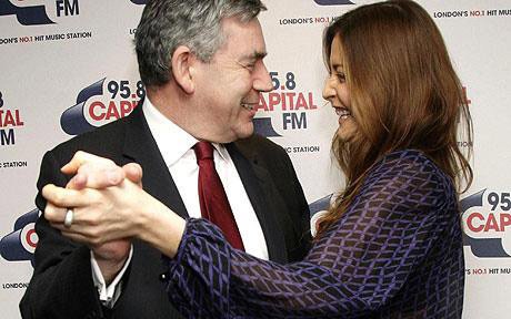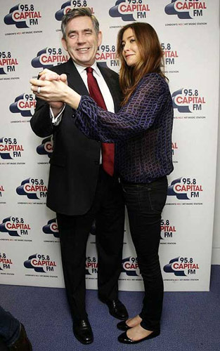 據(jù)英國媒體披露,11日首相布朗應(yīng)邀參加總部設(shè)在倫敦的“全球廣播電臺(tái)”的開業(yè)典禮,擔(dān)當(dāng)剪彩嘉賓。英國著名女主播麗莎·史諾頓也在受邀之列。剪彩后鑒于主持人的要求,兩人在偌大的舞廳里翩翩起舞。布朗精湛的舞技贏得美女名模兼主播的稱贊和掌聲。