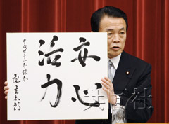 麻生在記者會(huì)上展示自己的書法杰作。他說(shuō):“我下定決心面對(duì)此時(shí)的困難時(shí)局,對(duì)人民的期望作出反應(yīng)。我要保護(hù)人民的生計(jì)。財(cái)政預(yù)算案是最重要的經(jīng)濟(jì)政策。”
