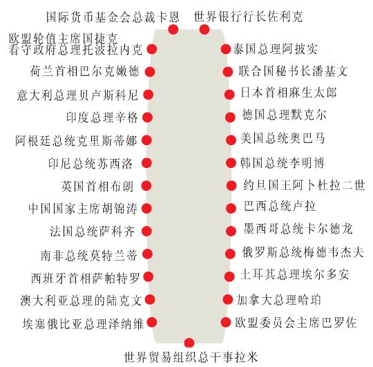 為體現(xiàn)此次峰會的代表性,一些國際和區(qū)域組織的領(lǐng)導(dǎo)人也應(yīng)邀出席了此次峰會,諸如世界銀行行長佐利克、世貿(mào)組織總干事拉米和國際貨幣基金組織總裁卡恩等。據(jù)悉,佐利克、卡恩及拉米三人分坐在宴會桌的兩頭。