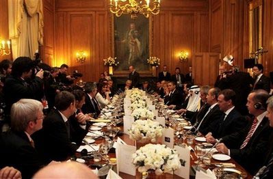 據(jù)《衛(wèi)報》4月2日披露,作為東道主,英國首相布朗坐在了橢圓形宴會桌主人應(yīng)該坐的位置上,中華人民共和國主席胡錦濤坐在他右側(cè),印尼總統(tǒng)蘇西洛坐在布朗的左側(cè),約旦國王阿卜杜拉二世坐在布朗的正對面。據(jù)悉,布朗將私下會晤阿卜杜拉,兩人將就兩國之間的軍火交易進行商談。法國總統(tǒng)薩科齊被安排坐在胡錦濤的右側(cè)。俄羅斯總統(tǒng)梅德韋杰夫被安排坐在墨西哥總統(tǒng)卡爾德龍和土耳其總理埃爾多安之間。
