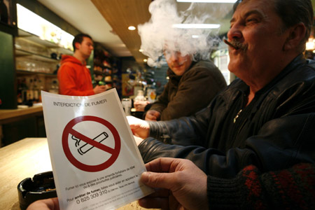 煙霧彌漫一直是法國人泡吧的特色,但為了跟上全民健康的歐洲潮流,法國終于從今年元月開始對(duì)28萬家咖啡館、酒吧和餐館等娛樂型公共場所實(shí)行禁煙令,成了歐洲最后一個(gè)實(shí)行類似禁令的國家。按照法規(guī),如果有煙民在公共場所不幸被執(zhí)法者逮到,每次將被罰68歐元,允許他吸煙的公共場所經(jīng)營者也將面臨135歐元至750歐元的罰款。另一方面,為配合戒煙,政府還煞費(fèi)苦心地將戒煙藥列入國家補(bǔ)助范圍。