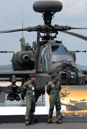 在新加坡航展上,俄羅斯沒有帶來什么吸引眼球的新產(chǎn)品。而美國則同印度防務(wù)展一樣,多家企業(yè)拿出拳頭產(chǎn)品。除已經(jīng)被世人所熟知的F-15、F-16戰(zhàn)斗機(jī)、AH-64“長弓阿帕奇”武裝直升機(jī)和V-22偏轉(zhuǎn)翼飛機(jī)等航展常客外,美國還推出了最新的第四代戰(zhàn)機(jī)F-35“閃電Ⅱ”。洛克希德-馬丁公司希望借此向亞太國家推銷500架左右的F-35,初步意向為日本、韓國、澳大利亞和新加坡四個買家。