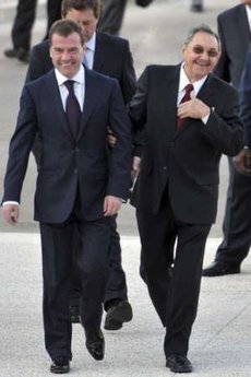 中新網(wǎng)11月28日電 綜合報道,俄羅斯總統(tǒng)梅德韋杰夫27日抵達哈瓦那,首次以總統(tǒng)身份訪問前冷戰(zhàn)時期盟友古巴。國力復蘇的莫斯科當局正通過確保能源安全、軍事和貿(mào)易等方式,強化在拉丁美洲的影響力。梅德韋杰夫當天同古巴國務委員會主席勞爾·卡斯特羅就雙邊關(guān)系及共同關(guān)心的國際問題交換意見。