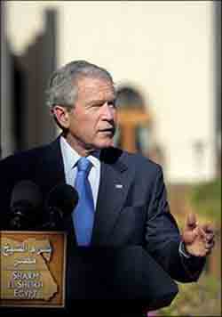 做客以色列和巴勒斯坦,是布什此訪的重中之重。在會(huì)晤以巴領(lǐng)導(dǎo)人后,布什就巴難民回歸、巴以最終邊界劃分和耶路撒冷地位等以巴沖突核心問(wèn)題闡述了自己的主張。布什稱,難民問(wèn)題可以通過(guò)建立巴勒斯坦國(guó)得到解決,同時(shí)輔以相關(guān)賠償機(jī)制。布什呼吁以色列結(jié)束1967年以來(lái)對(duì)阿拉伯土地的占領(lǐng),確保巴成為獨(dú)立自主國(guó)家?伤终f(shuō),以巴未來(lái)邊界將不可能完全依據(jù)第三次中東戰(zhàn)爭(zhēng)之前的;鹁,雙方應(yīng)根據(jù)目前實(shí)際情況進(jìn)行調(diào)整并達(dá)成協(xié)議。關(guān)于耶城歸屬問(wèn)題,布什認(rèn)為這是一個(gè)棘手難題,牽涉政治和宗教。他再次要求以巴為在今年內(nèi)達(dá)成和平協(xié)議作出“痛苦讓步”。