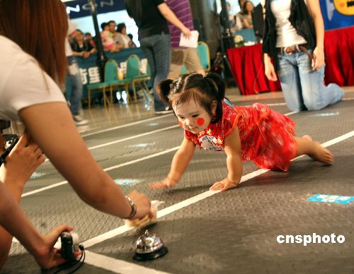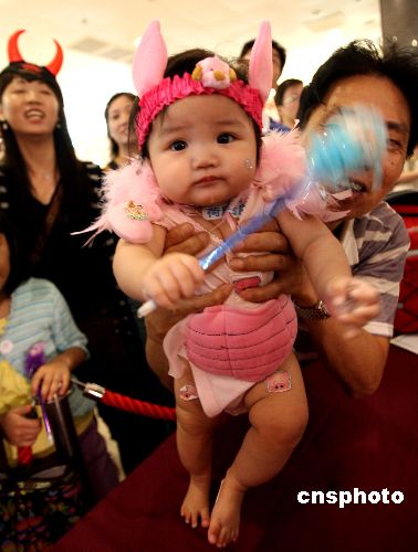 二十八日,香港一百多位5-12個月的BB打扮成各種模樣,在荷里活廣場參加“嘩鬼BB爬行大比拼”比賽,慶祝萬圣節(jié)的到來。圖中BB的父母們?yōu)閰⒓舆@項活動精心打扮孩子,使出渾身解數(shù)引誘BB向前爬行。香港多家商場今日借輕松而又有趣的萬圣節(jié)做宣傳主題,帶動商場人氣熱旺。中新社發(fā) 王麗南 攝