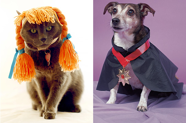 圖片二:左邊一副圖片中,一只可愛的小貓頭頂一副麻花辮假發(fā),也許它想用它來嚇唬其他動物,可它沒想到這樣讓它看起來更可愛;在右邊一幅圖片中,一只小狗打扮成吸血鬼的模樣,威風凜凜的可愛模樣足以嚇走別人么?(鐘巖)