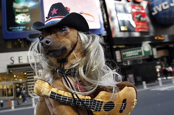 圖片四:沒聽說過“赤裸牛仔”么?那你可要落伍了!“赤裸牛仔”可是時(shí)代廣場最有名的人物之一。這不,連這個(gè)吉娃娃都是他的忠實(shí)粉絲,打扮成他最紅火時(shí)流浪歌手的模樣。(鐘巖)