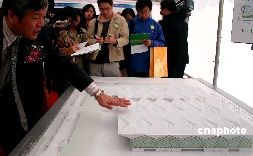 世博集團(tuán)董事長(zhǎng)戴柳(左)在首次亮相的“世博會(huì)主題館模型”前介紹說(shuō),這一展館的建設(shè)成本將控制在十三億人民幣左右。