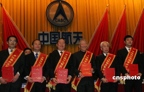 總設(shè)計(jì)師孫家棟(右三)和中國(guó)工程院院士、繞月探測(cè)工程副總設(shè)計(jì)師龍樂(lè)豪(右二)等“首次月球探測(cè)工程突出貢獻(xiàn)者”頒發(fā)榮譽(yù)證書(shū)。