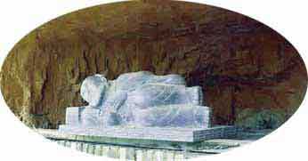 鐘祖洞:鐘離權(quán),又稱漢鐘離,坦胸露腹,大眼睛,紅臉面,頭上扎著兩個丫髻.他為漢時將軍,兵敗后逃至山谷,遇東華先生傳他金丹火候,金科靈火,又往崆峒山訪道。太上老君身騎青牛,手執(zhí)寶扇,立于面前曰:“普濟渡世,綿山養(yǎng)功!辩婋x來到這里,見紫氣繚繞,故在此洞中修行,終于練成八段錦道功。后又往返于崆峒山、綿山兩地,普濟眾生。八段道功集治病養(yǎng)生為一體。