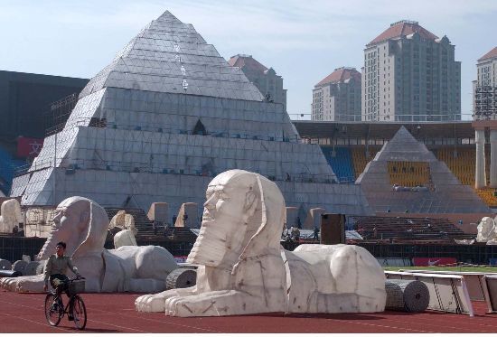 一座高達四十七米的金字塔模型曾出現(xiàn)在北京工人體育場。這里正在搭建世界超大型景觀歌劇《阿依達》的舞臺。該舞臺面積達六千多平方米。作為北京國際戲劇演出季的重頭劇目,《阿依達》上演。以后這種活動可能要繳費。中新社發(fā) 張煒 攝