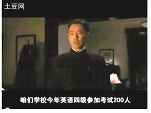 于是,惡搞版《色,戒》出爐了:易先生變成梁校長(zhǎng),收到副官的“四級(jí)考試有人作弊”報(bào)告后,下令補(bǔ)考否則不能畢業(yè),而王力宏及一幫掙扎在四級(jí)苦海中的學(xué)生毅然決定派王佳芝作弊,找個(gè)補(bǔ)考老師(庹宗華),實(shí)行“一人吃飽,全家不餓”的作弊方式,但校方道高一丈,派出“無(wú)間道”班底的監(jiān)聽(tīng)員,最終一網(wǎng)打盡,王佳芝與鄺裕民被處以開(kāi)除學(xué)籍的處分。