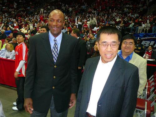 火箭隊“滑翔機”得雷克斯勒(右)見到老朋友王寧后特別高興。美國《明橋體育》供圖 / 許陽 言心 攝影