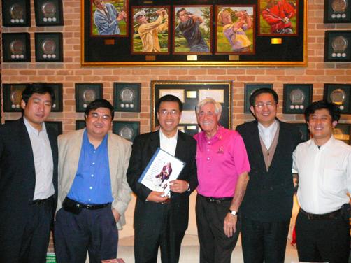 王寧部長(左3)在《明橋體育》負責人和當?shù)刂A人企業(yè)家郭翔的陪同下,拜訪六十年代國際著名的高爾夫球星道格-桑德斯(右3),并邀請他到中國去訪問。美國《明橋體育》供圖 / 許陽 言心 攝影