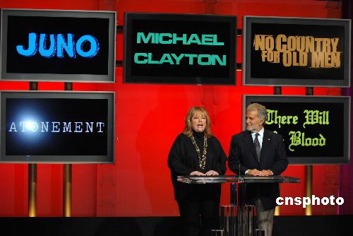 第八十屆奧斯卡金像獎提名名單二十二日拂曉如期公布,《老無所依》(又譯《險(xiǎn)路勿近》)、《未血綢繆》(又譯《血色黑金》)、《邁克爾·克萊頓》、《朱諾》和《贖罪》入圍最佳影片。中新社發(fā) 張煒 攝