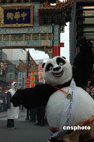 圖為游行隊(duì)列中的超級(jí)大熊貓?jiān)谥腥A街匾額下向游客揮手致意。
