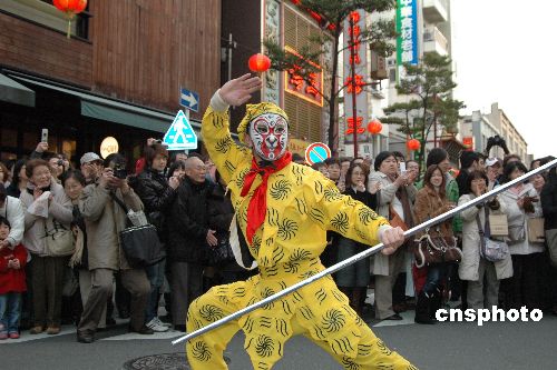圖為游行隊(duì)列中深受日本民眾喜愛(ài)的孫悟空以其高超的功夫博得一片喝彩。