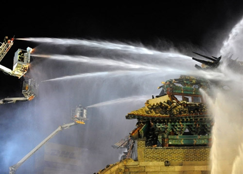 2月11日,在韓國首爾市中心的崇禮門殘骸附近,韓國候任總統(tǒng)李明博到現(xiàn)場視察。韓國各界對國寶級建筑崇禮門在當天凌晨被焚毀感到十分痛心,對火災原因表示關注。