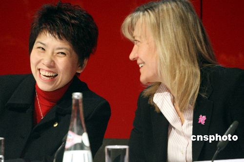 當?shù)貢r間11日下午,北京奧組委奧運村部副部長鄧亞萍(左)和倫敦奧組委的官員、網(wǎng)球運動員出身的Debbie Jevans(右)在“婦女與奧運”論壇上交談。