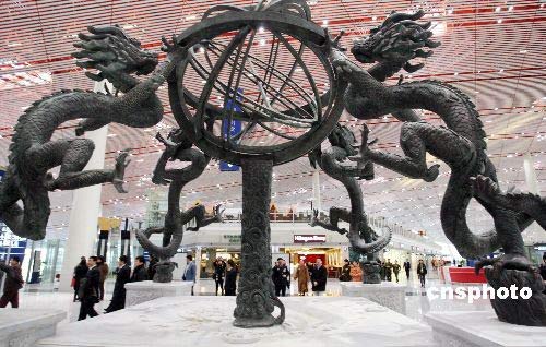 中國雕龍渾天儀落戶北京首都機(jī)場3號航站樓。