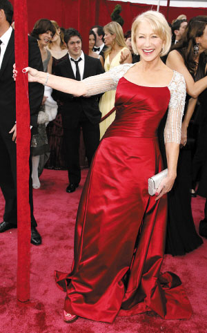 海倫·米倫 最成熟的紅色穿法。去年的奧斯卡影后海倫·米倫以一身“女王紅”亮相,米倫本人非常喜歡這條George Chakra長(zhǎng)裙,“它有一種無(wú)形流露的力量感”,袖子部位則全部由施華洛世奇的水晶綴成。