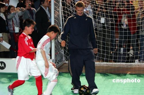 3月3日,足壇巨星貝克漢姆在上海出席中國球迷見面會,并與在滬進城務(wù)工子弟“交流球技”。中新社發(fā) 湯彥俊 攝