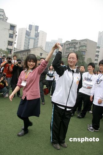 圖為現(xiàn)場兩位跳得最好的女高中生(右為中國女生)在校園里切蹉、展示“舞”藝,增進友誼。