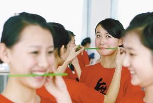 于是,姑娘們每天對(duì)著鏡子練微笑。老師要求每個(gè)人在練習(xí)笑容時(shí),嘴里都要咬著一根筷子找感覺。這樣一笑就得幾十分鐘,笑得連臉部肌肉都麻了,有時(shí)甚至?xí)テ谱臁?/p>