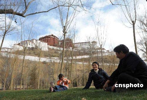 3月20日,拉薩市一個三口之家在布達(dá)拉宮下的宗角祿康內(nèi)休閑娛樂。