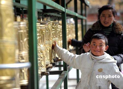 3月20日,一名可愛的拉薩兒童在布達(dá)拉宮北側(cè)轉(zhuǎn)經(jīng)。