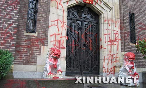 3月15日,“藏獨(dú)”分子噴涂、污毀中國(guó)駐比利時(shí)使館大門(mén)。