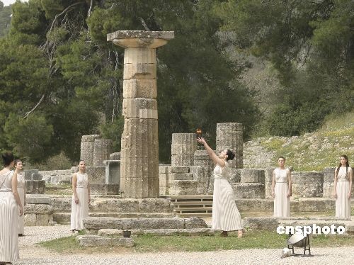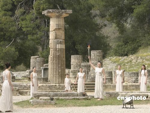 當(dāng)?shù)貢r(shí)間3月23日,北京奧運(yùn)圣火采集最后一次彩排在希臘古奧林匹亞遺址舉行,最高女祭司瑪利亞·娜芙普利都高舉已經(jīng)引燃的火炬。中新社發(fā) 王歡 攝