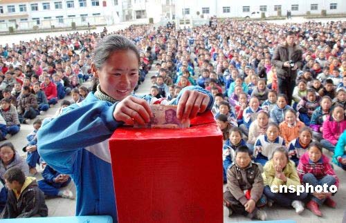 拉薩市堆龍德慶縣中學(xué)的1825名師生3月23日向“3·14”事件受害民眾捐款,同學(xué)們拿出平時(shí)節(jié)省的零花錢踴躍獻(xiàn)愛心。3月14日拉薩市發(fā)生打、砸、搶、燒事件后,拉薩市各企事業(yè)單位、民間組織等社會(huì)各界紛紛譴責(zé)達(dá)賴集團(tuán)的罪惡行徑,紛紛捐款捐物關(guān)懷受害無辜民眾。中新社發(fā) 周波 攝