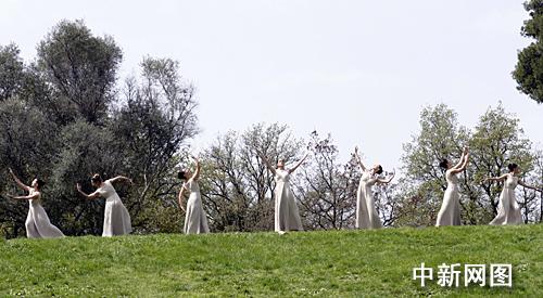 希臘當(dāng)?shù)貢r間3月24日,北京二00八年奧運會圣火采集儀式在古奧林匹亞競技場舉行,最高女祭司順利采集到火種。儀式上女祭司表演的舞蹈靈感來自古希臘廟宇門楣上的雕塑。中新社記者 王歡