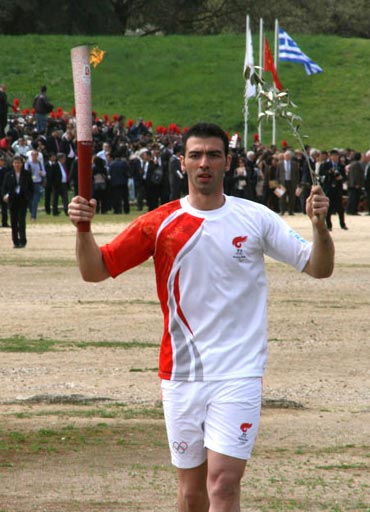 當(dāng)?shù)貢r(shí)間二十四日上午十一時(shí)四十八分,北京奧運(yùn)圣火在古奧林匹克遺址點(diǎn)燃。最高女祭司在古奧林匹克競技場入口處點(diǎn)燃第一名火炬手、曾獲雅典奧運(yùn)銀牌的希臘跆拳道運(yùn)動(dòng)員亞歷山大·尼克拉澤斯手中的火炬,同時(shí)將橄欖枝傳遞給他。亞歷山大舉起第一支燃燒的“祥云”火炬,開啟了北京奧運(yùn)“點(diǎn)燃激情、傳遞夢想”的火炬?zhèn)鬟f旅程。