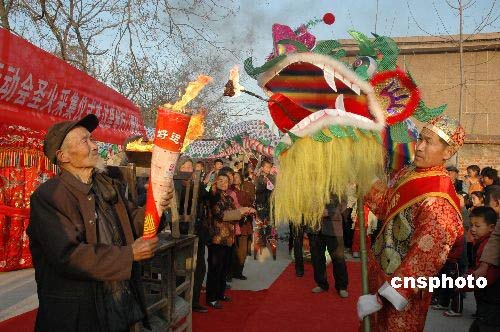 2008年3月24日,奧運圣火采集儀式在希臘隆重舉行的同時,山東省棗莊市市中區(qū)齊村鎮(zhèn)柏山村的農(nóng)民們,在村里的千年老槐樹下以當(dāng)?shù)刈顐鹘y(tǒng)的方式模擬了圣火采集過程。中新社發(fā) 張大東 攝